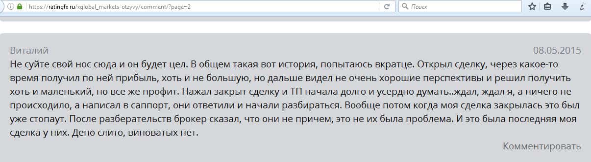 - Отзыв некого Виталий на сайте ratingfx ru о сбивании стоплоссов конторой XGLOBAL
