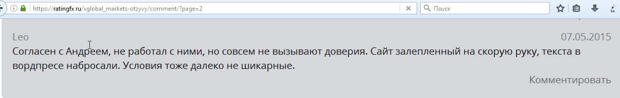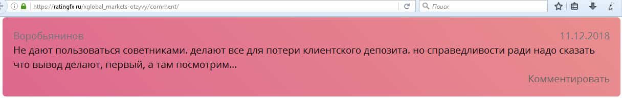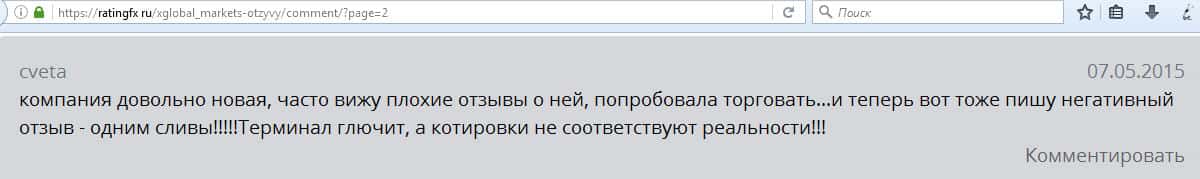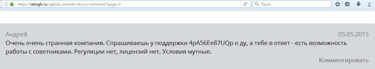 На информационном сайте ratingfx ru некто Воробьянинов пишет о том, что в конторе XGlobal все делается для того, чтобы слить депозит клиенту, даже запрещено пользоваться советниками. Настоятельно советуем трейдерам не связываться с сомнительными конторами.