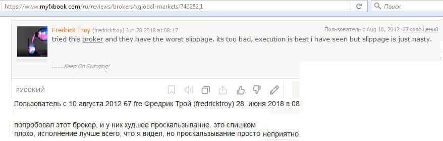 На портале форума myfxbook com подобно другим веб-площадкам, что размещают инфу о РАЗВОДИЛАХ, человек под никнеймом Fredrick Troy разместил отзыв о Х Глобал. В нем автор рассказывает о слишком частых проскальзываниях цены, которые сливают депо трейдеров. Контора XGLOBAL - явные АФЕРИСТЫ !!!
