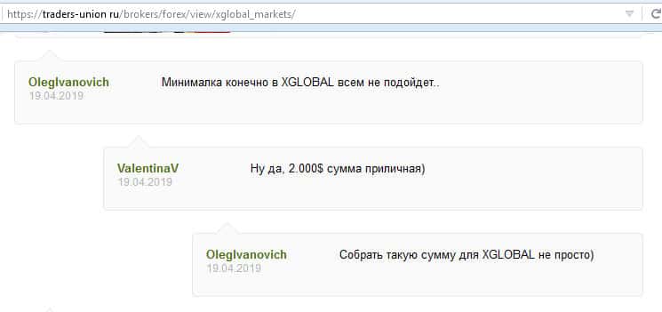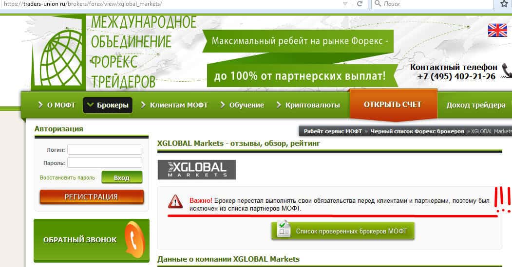 На информационном портале traders-union ru в сведениях о компании XGLOBAL висит предупреждение, что данная контора перестала выполнять свои обязательства перед клиентами, поэтому была исключена из партнеров «Международного Объединения Форекс Трейдеров».