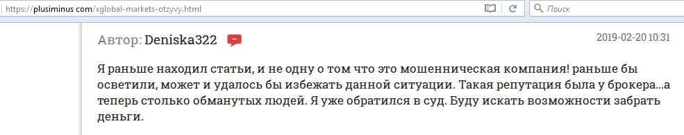 Некий Deniska322 в своем отзыве на веб-портале плюсиминус ком пишет, что очень сожалеет о том, что в сети интернета раньше не осветили мошенническую деятельность конторы ХГЛОБАЛ, тогда бы он не понес финансовые потери. Теперь же ему предстоит судиться в попытке возвратить деньги.