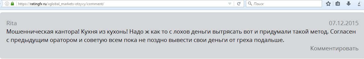 Если у Вас еще сохранились сомнения в том, что Х Глобал мошенники, советуем ознакомиться с еще одним отзывом, найденным на сайте ratingfx ru, написанным пользователем Rita. В нем говорится, что контора вытряхивает деньги с лохов и не возвращает их обратно. ХГЛОБАЛ - КУХНЯ !!!