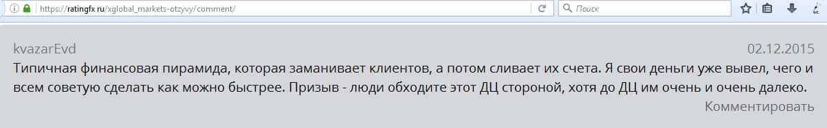 На интернет-сайте ratingfx ru найден еще один отзыв, в котором трейдерс ником kvazarEvd призывает обходить мошенников XGLOBAL стороной, так как они типичная финансовая пирамида, которая рано или поздно присвоить деньги клиента.
