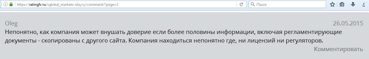 - Мнение c сайта ratingfx ru некого пользователя Oleg о липовых документах компании XGLOBAL