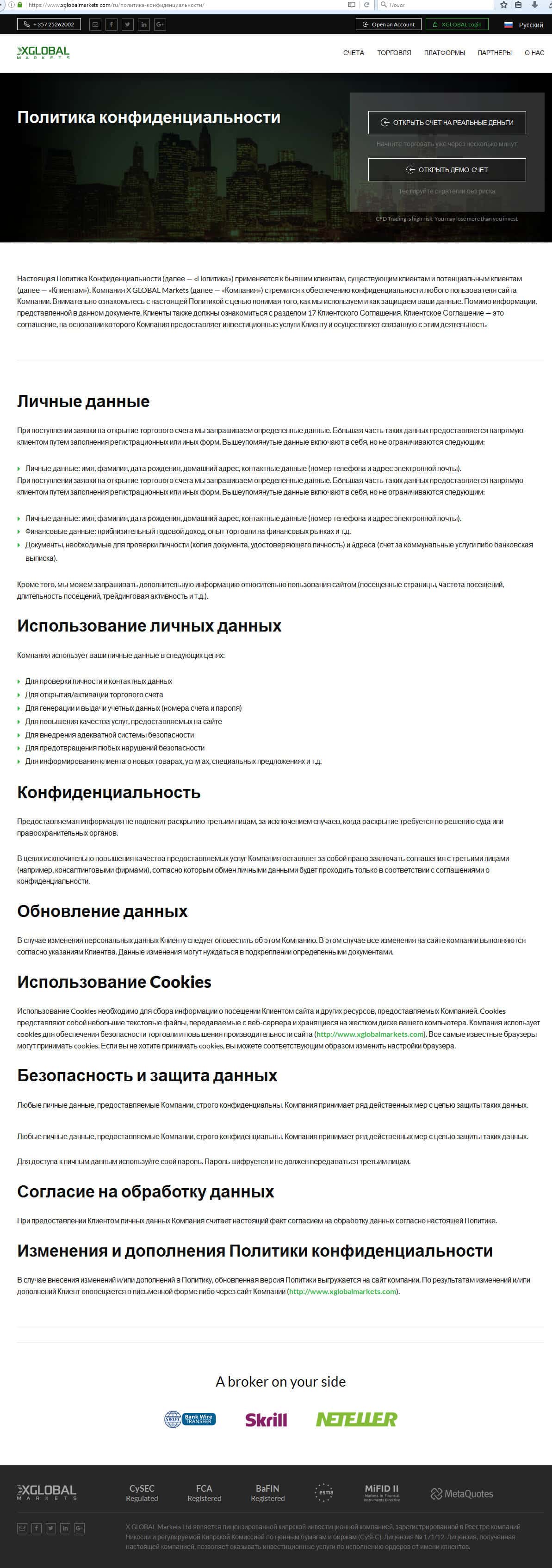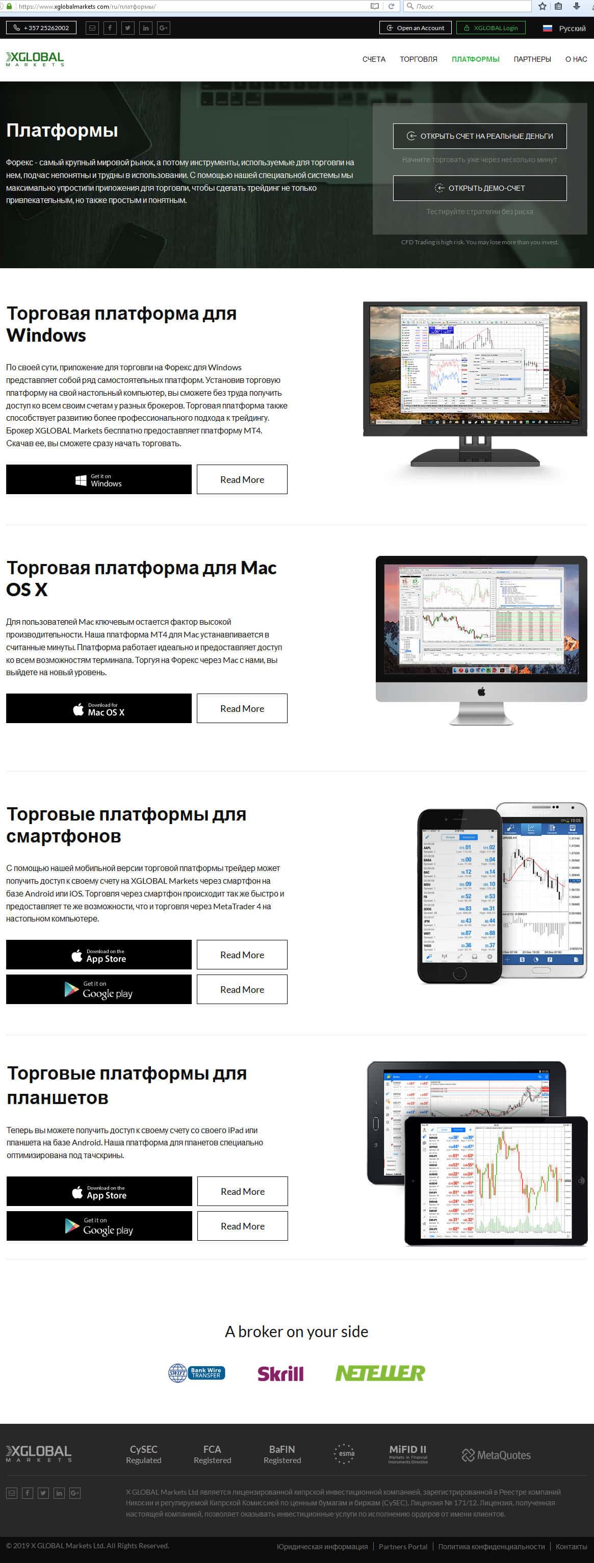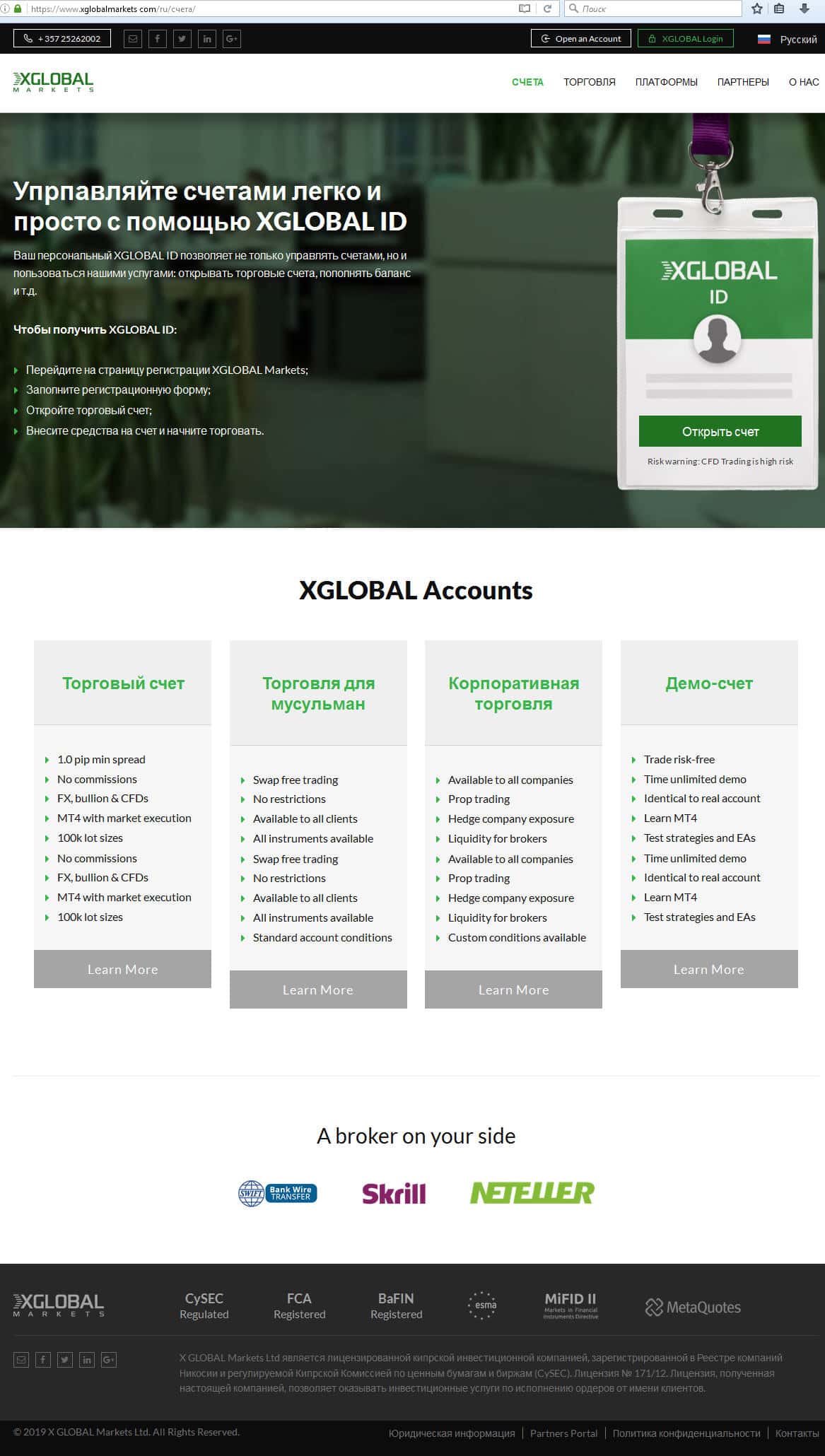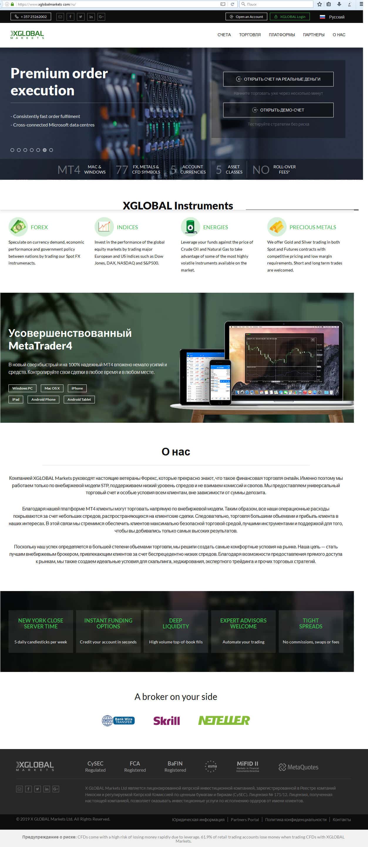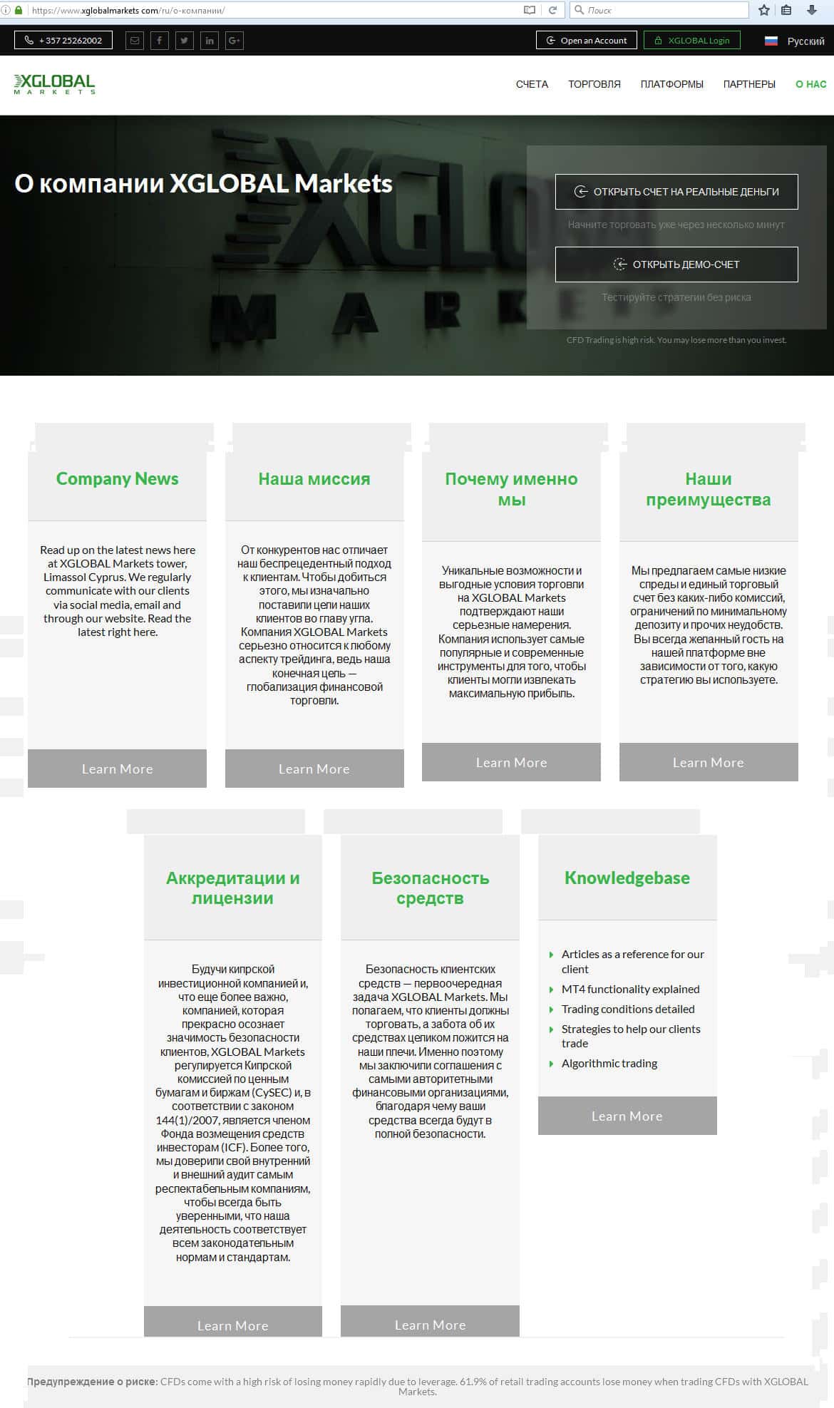 На первый взгляд сайт форекс брокера ХГлобал внушает надежность, но вся инфа на странице это рекламный ход и верить ей НЕЛЬЗЯ. Сайт xglobalmarkets com - это обычный корпоративный коммерческий проект, идея которого привлечь будущего клиента, а точнее, заполучить контактные данные еще одного лоха.