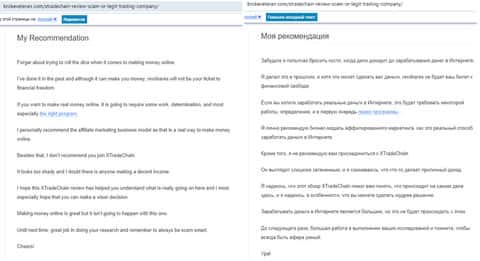 На одном из сайтов, была размещена подробная статья-отзыв, в которой человек полностью раскрыл сущность работы лохотрона XTradeChain. Аферисты используют популярные методы обворовывания клиентов, которые решили, что в мире придумали кнопку "бабло" и за копейки ее продают.