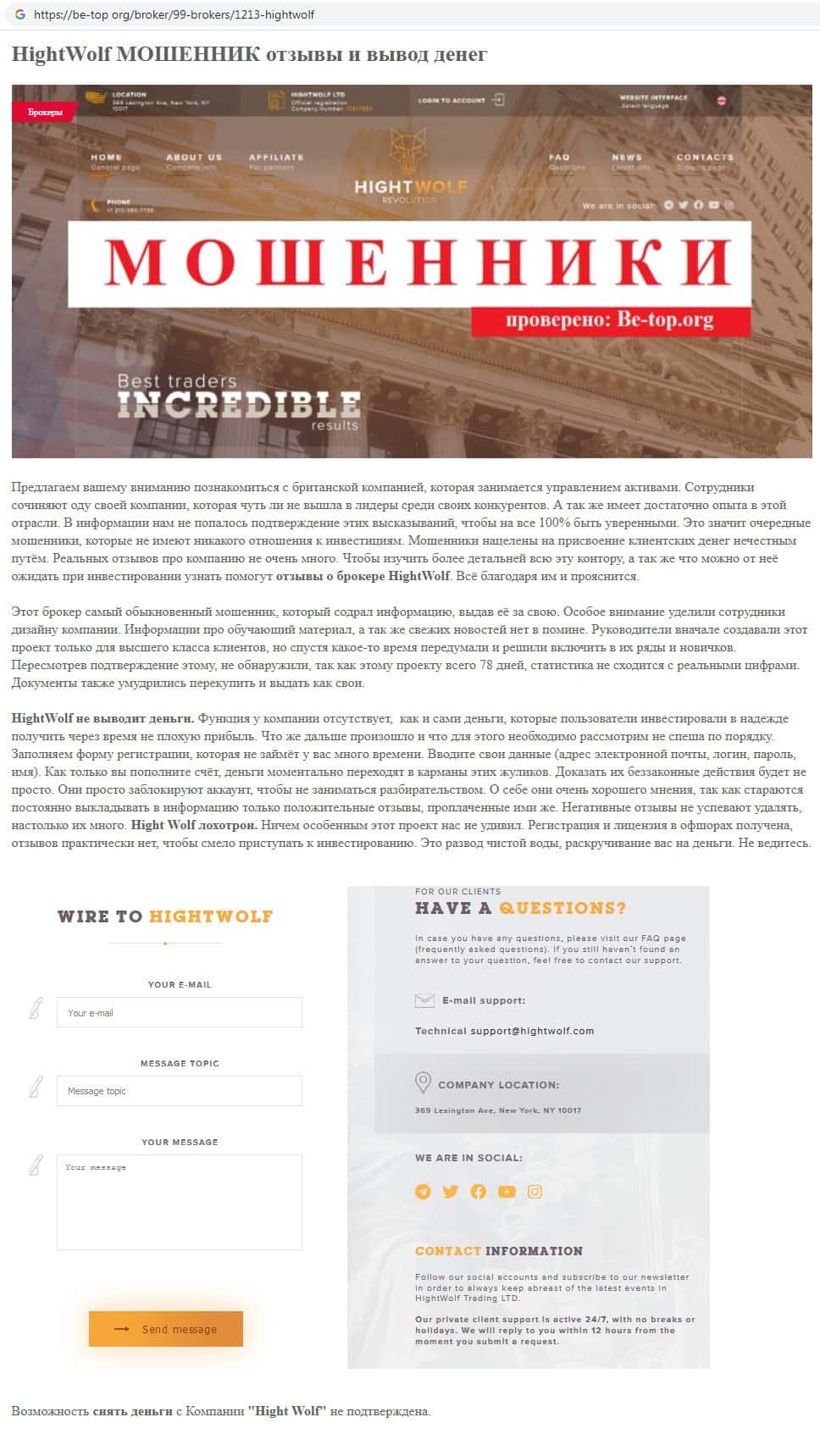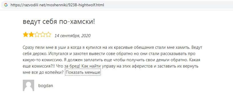 Во всемирной паутине есть множество пользовательских отзывов подтверждающих то, что жулики Хай Волф не выводят деньги, клиенты остаются ни с чем.