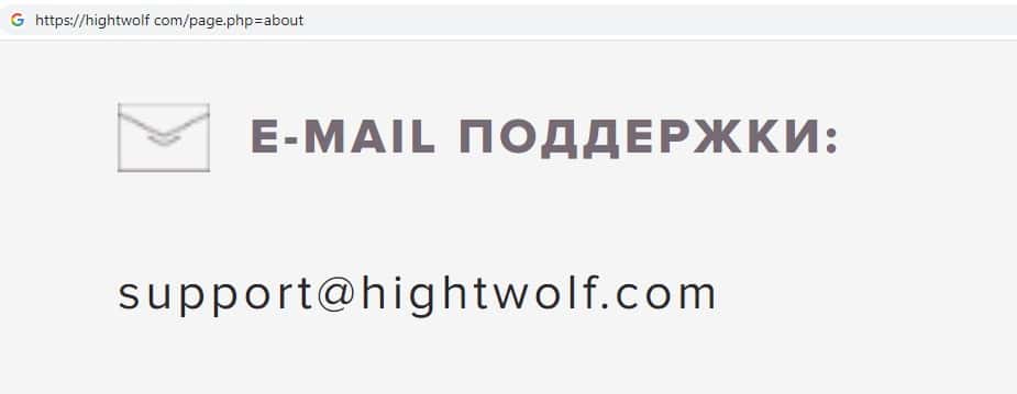 Мошенники Hight Wolf на своем официальном интернет-ресурсе указывают адрес электронной почты, а именно: