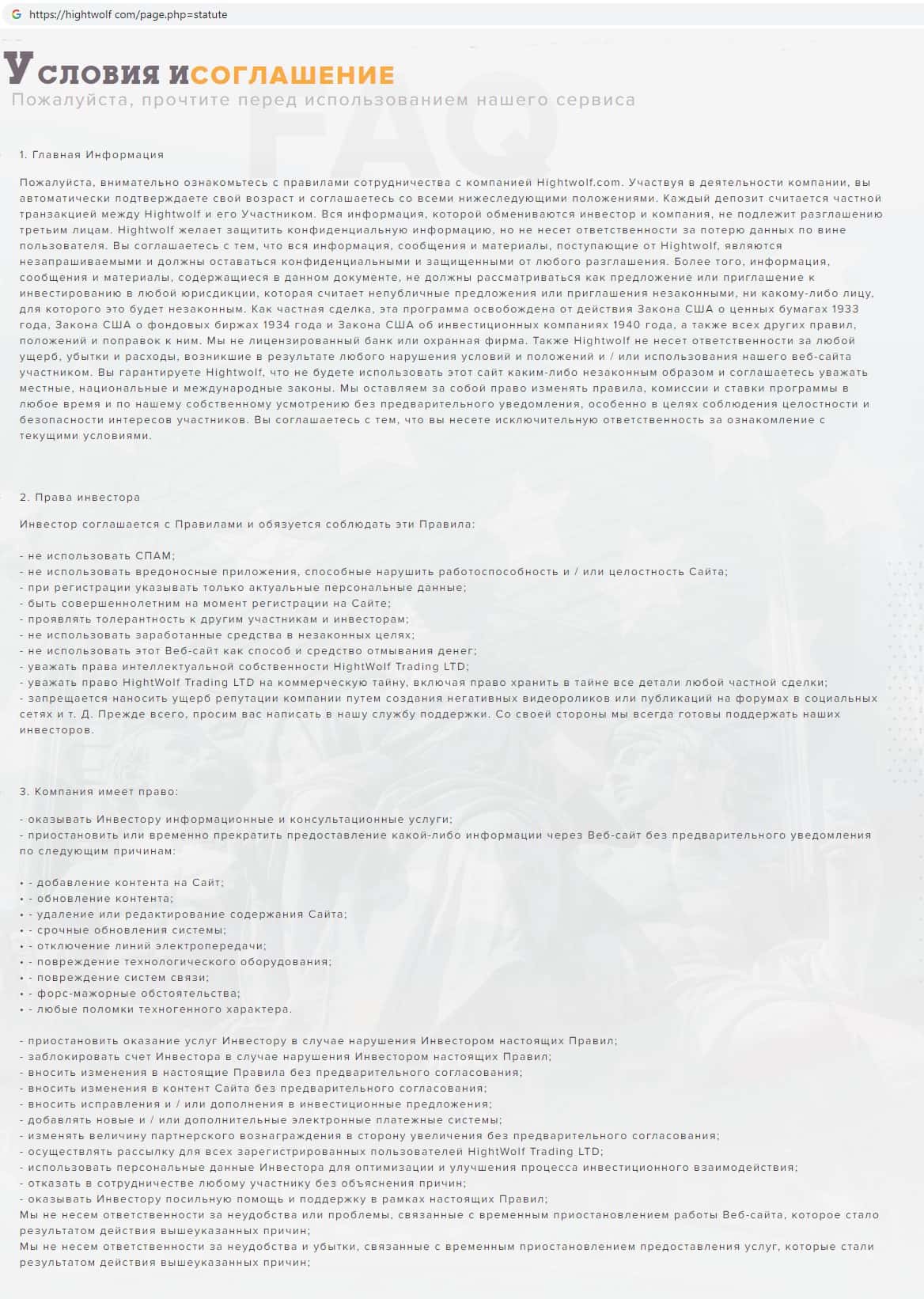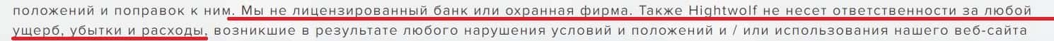 Согласно тому, что аферисты пишут в соглашении, компания Hight Wolf не несет никакой ответственности за не полученную прибыль клиентом, а так же за возможные убытки.