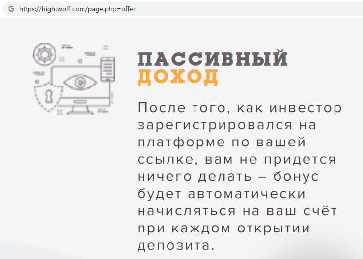 Аферисты Hight Wolf рассказывают сказки о возможности получения прибыли из неоткуда, а также об автоматическом начислении бонусных средств, которые со счета снять невозможно.
