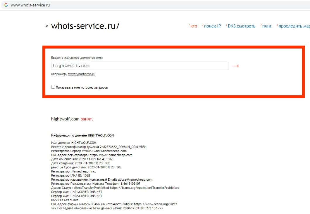 - Информация о владельце домена конторы Хай Волф отсутствует