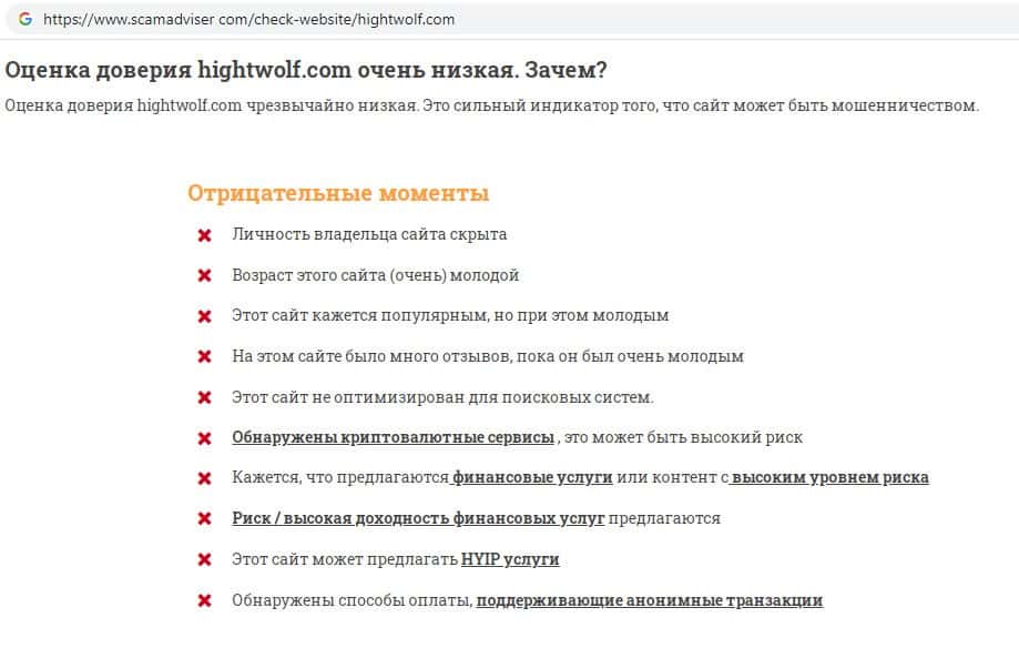 Проверка Hight Wolf на сайте scamadviser com показала, что у данного сайта низкий рейтинг, а также выявлено множество отрицательных моментов в работе сервера.