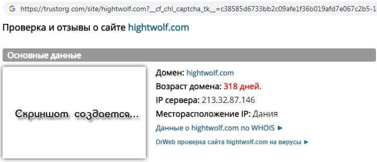 Проверка онлайн-сервиса обманщиков Хай Волф на trustorg com показала, что возраст домена к моменту написания статьи составляет 318 дней, вероятнее всего домен купленный.