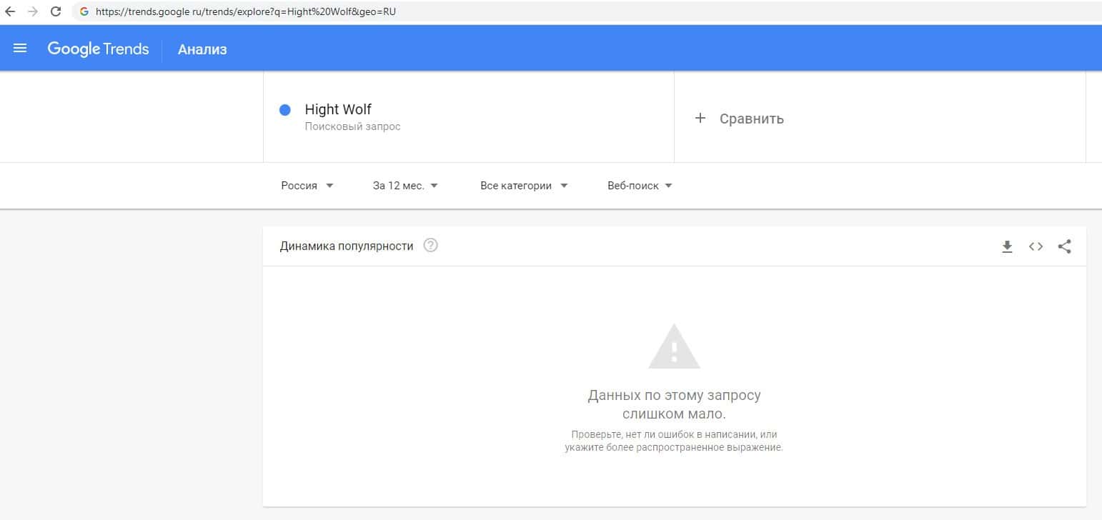 О количестве запросов по бренду названия домена компании "hightwolf.com" на Гугл Трендс нет никакой информации.