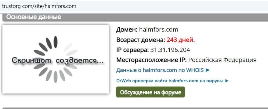 Возраст доменного имени сайта halmfors com равен 243 дня. Видно, что контора организована недавно, это новый лохотрон, который не может быть солидной компанией.