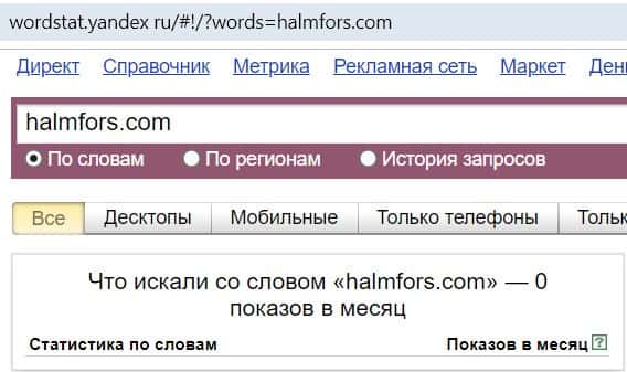 В поисковой системе Яндекс сайт брокерской конторы "halmfors.com", вбитый в строку с точкой, пользователи не искали ни разу за месяц.