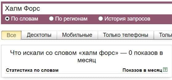 Название бренда на русском языке без пробела "ХалмФорс", пользователи также совсем не искали в системе Яндекс.