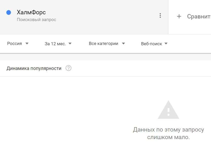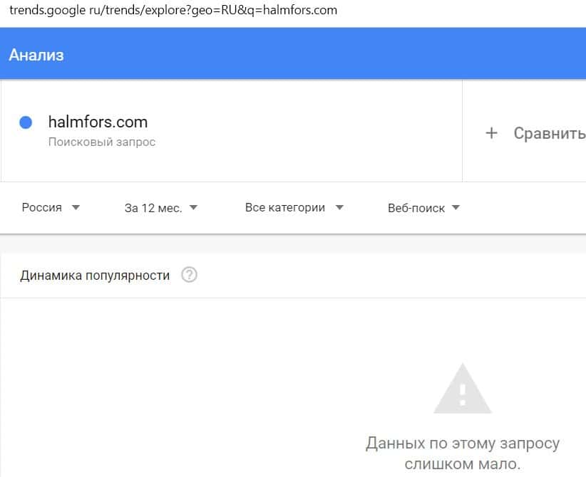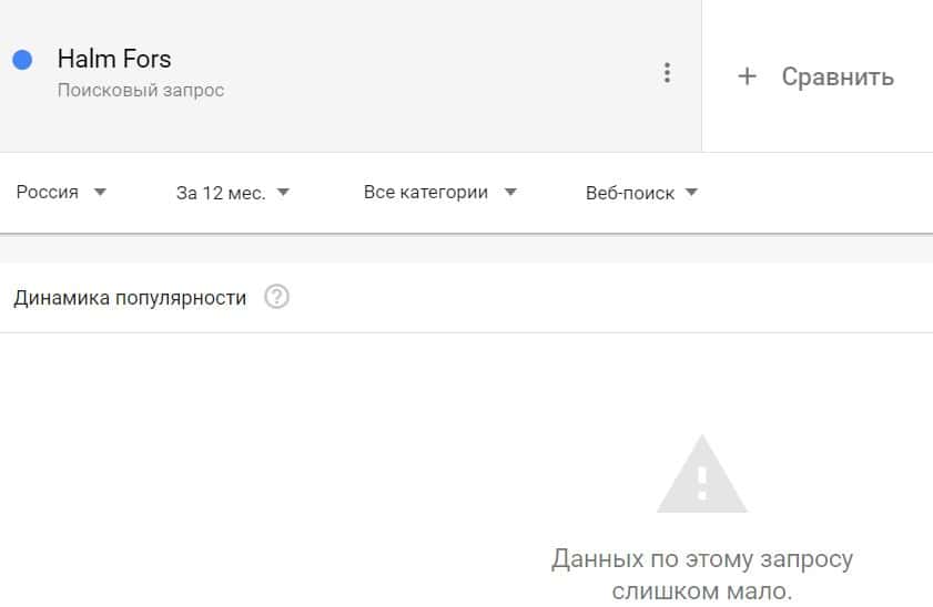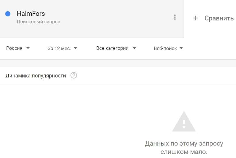 Посмотрим, насколько популярно название бренда "HalmFors", написанное на английском языке. Данных по этому запросу нет, так как никто не искал этот бренд в Гугл.