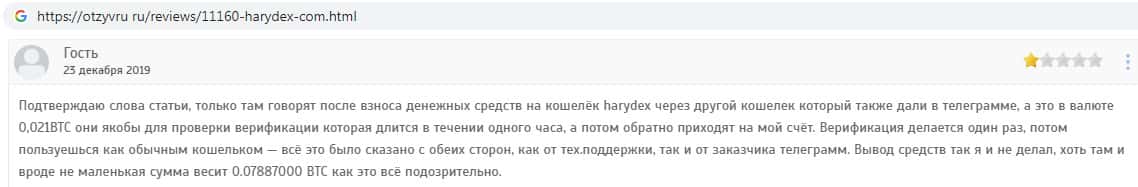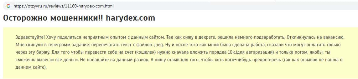 На веб-портале otzyvru ru обнаружен отзыв об аферистах Harydex. Автор данного отзыва пишет о том, что решила немного подзаработать, в результате чего осталась ни с чем. На сайте мошенников Харидекс невозможно получить какую-либо прибыль, поскольку это всего лишь навсего очередная финансовая пирамида.