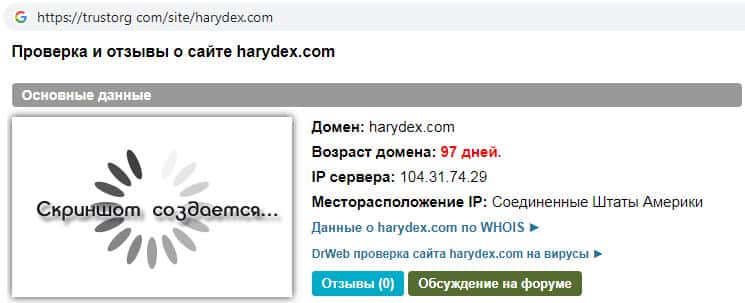 - Проверка домена сайта скам-организации Harydex на возможное мошенничество