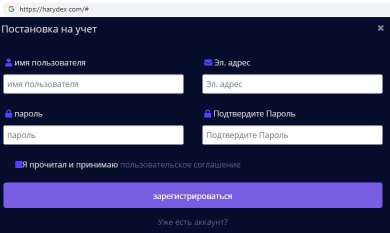 Для того, чтобы зарегистрироваться на сайте аферистов Harydex необходимо назвать свое имя, адрес электронной почты и пароль, и конечно же подтвердить то, что Вы принимаете правила пользовательского соглашения. Ведь связавшись с шулерами Харидекс Вы рискуете потерять все свои деньги и возможно быть по уши в долгах, набравшись кредитов.