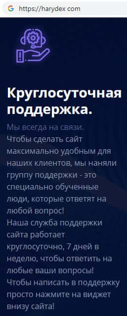 Аферисты Harydex так же пишут о том, что у них на сайте якобы есть круглосуточная поддержка. Но при попытке вывести свои денежные средства приготовьтесь к тому, что мошенники попросту перестанут отвечать на телефонные звонки. Но в случае вывода денежных средств, жулики Харидекс не несут ни за что ответственности.