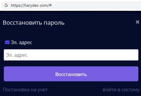 Во время регистрации на сайте мошеннической организации Harydex клиент сам придумывает и указывает пароль его аккаунта. При этом все данные фиксируются администрацией сайта. В любом случае компания имеет доступ к данным клиента, но в данном случае перекладывает всю ответственность на того, кто регистрируется.