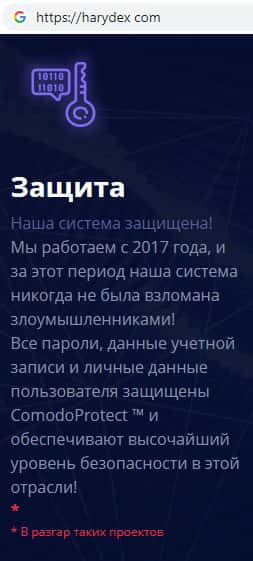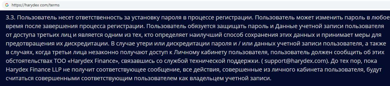 Мошенники Харидекс убеждают пользователей своего сайта в том, что их система абсолютно безопасна. Для того, чтобы им доверяли они готовы пообещать все что угодно. Доступ к учетной записи пользователя прежде всего имеет сама компания Harydex, которая в любой удобный им момент может заблокировать аккаунт без предварительного уведомления.