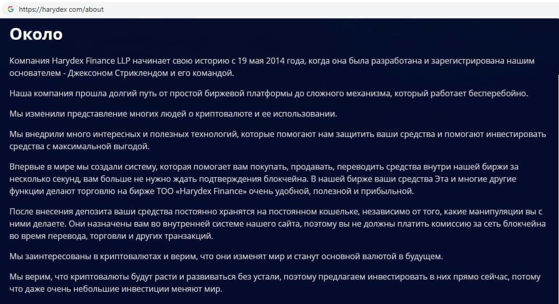 Шулера Harydex рассказывают сказки о надежности их компании, сильно приукрашивая информацию о своей конторе. Это делается для того, чтобы втереться в доверие к людям и мотивировать к торговле на данном сайте. Информация об основании данной конторы не соответствует возрасту домена их дырявого сайта !!!