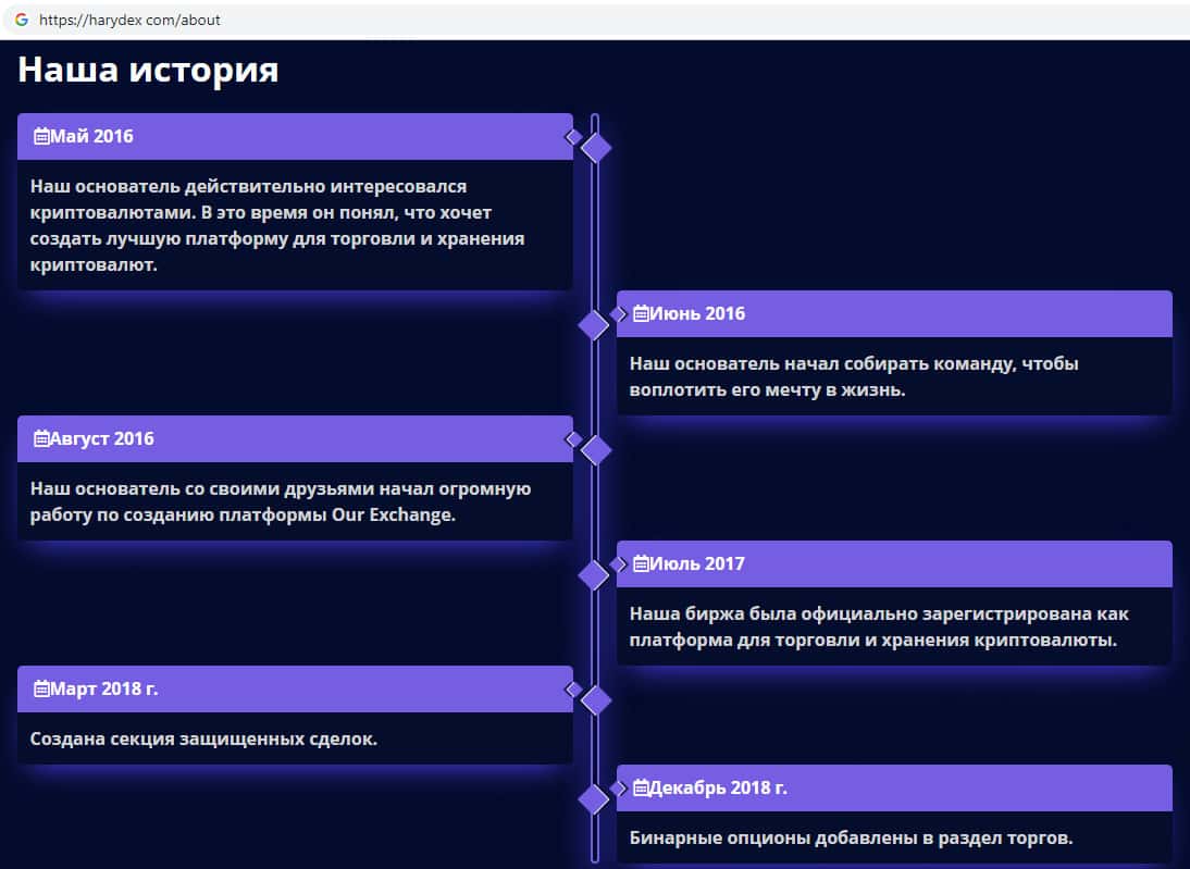 Очередным доказательством того, что Харидекс - очередной развод является то, что здесь мошенники пишут, что их контора работает с 2017-го года, но в одном из разделов о компании написано, что она была основана в 2016-м году. Доверять сомнительной жульнической конторе Harydex не рекомендуем !!!