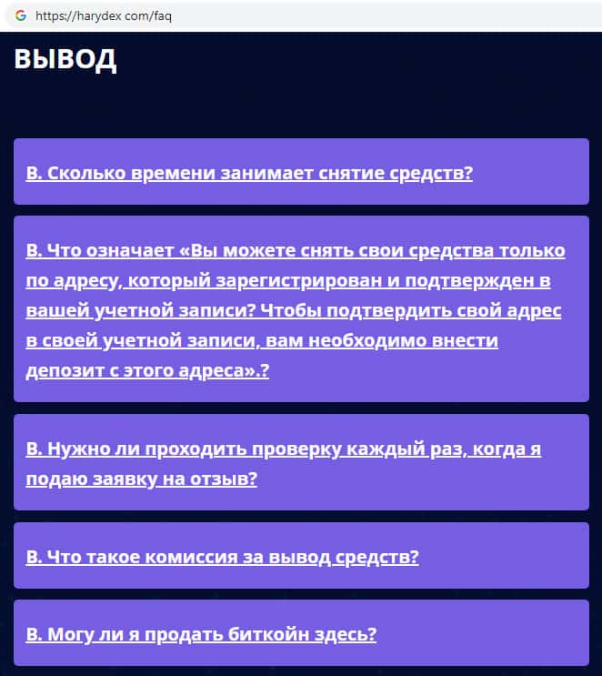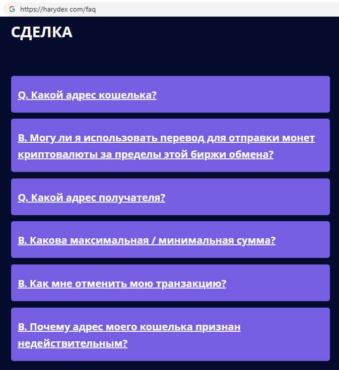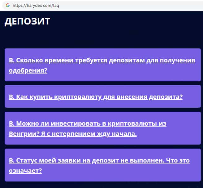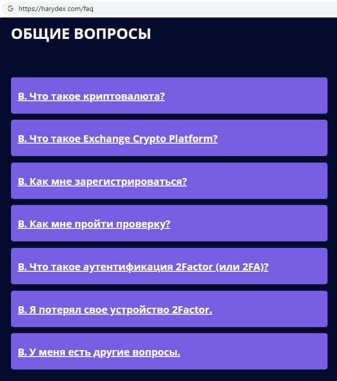 На официальном сайте мошенников Harydex были замечены уже заранее продуманные всевозможные ответы на те вопросы, которые могут задавать клиенты, например в случае неудачной сделки или же каких либо проблем связанных с работой на сайте. Достоверными ли являются ответы на вопросы знают только те, кто пострадал связавшись с Харидекс.