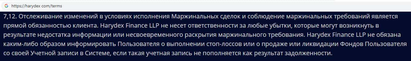 В уведомлении о рисках жульническая организация Harydex указывает о том, что торговля на сайте сопряжена определенным уровнем риска. Соответственно данная брокерская компания не несет никакой ответственности за деньги утраченные клиентом на их фальшивом сайте. В данном случае аферисты Харидекс ссылаются на ошибочный выбор торговой стратегии клиента.