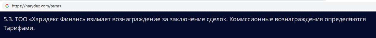 Здесь шулера Харидекс уведомляют о том, что их контора берет комиссию за снятие денежных средств, а так же вознаграждение за заключение сделок, которое определяется тарифами. Но на своем официальном сайте данная скам-компания не указывает никакой информации о тарифных планах и сумме комиссии.