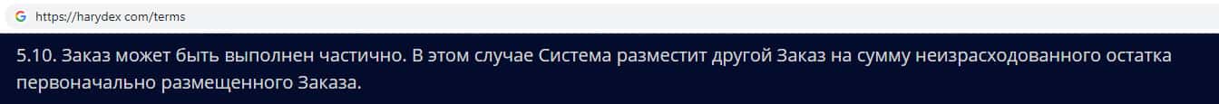 Аферисты Harydex в своем пользовательском соглашении уведомляют о том, что заказ может выполнен частично. Так же жулики могут вернуть не всю сумму денежных средств с торгового счета, а только лишь часть баланса. Поэтому надеяться на возможность получения какой-либо прибыли, связавшись с конторой Харидекс не имеет смысла !!!