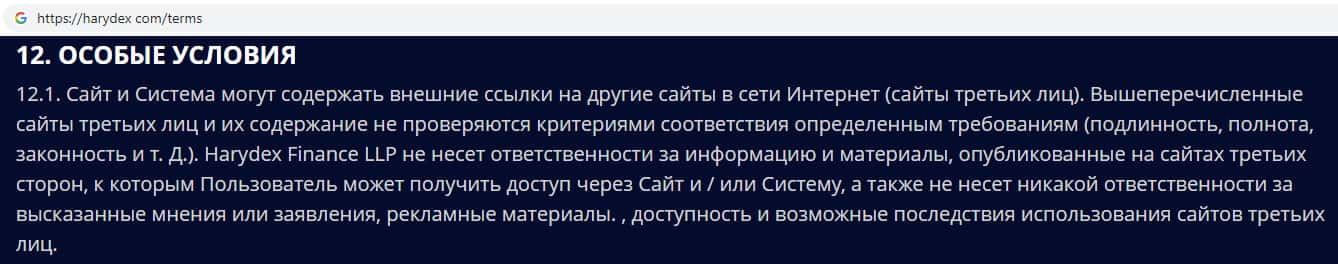 Мошенники Харидекс в одностороннем порядке без предварительного уведомления, могут менять условия пользования сайтом. Регистрируясь на данном сайте Вы соглашаетесь со всеми условиями. Внимательно читайте всю информацию на сайте жульнической организации Harydex !!!