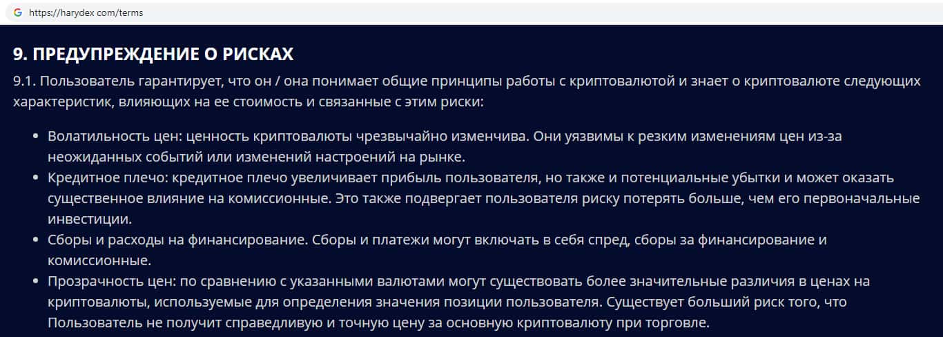 Шулера Harydex врут об отсутствии рисков потери денежных средств в торговли криптовалютой на их дырявом сайте