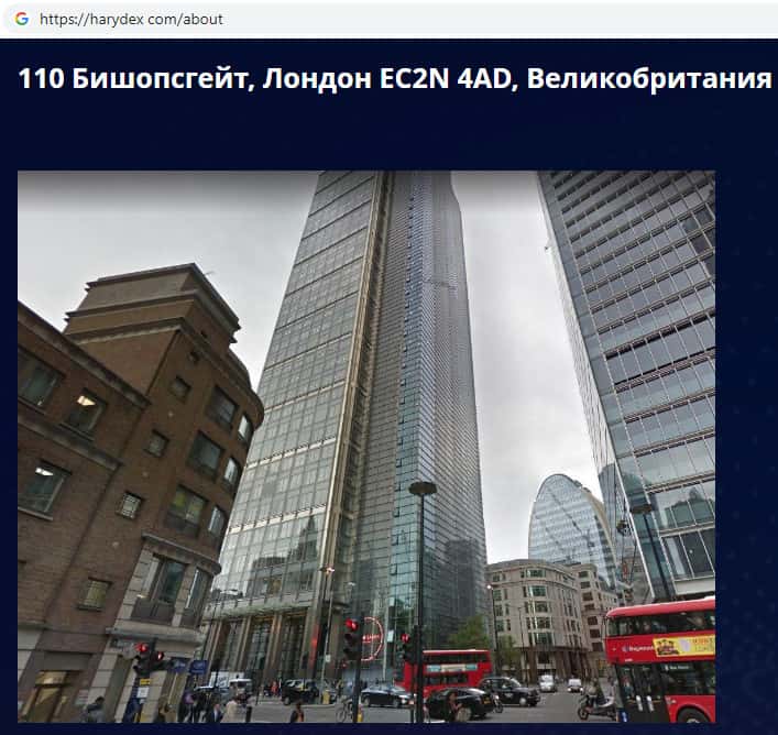 Согласно контактной информации, которую указывает о себе мошенническая организация Harydex зарегистрирована в британской столице, Лондоне. Где ныне базируется огромное количество аналогичных компаний.