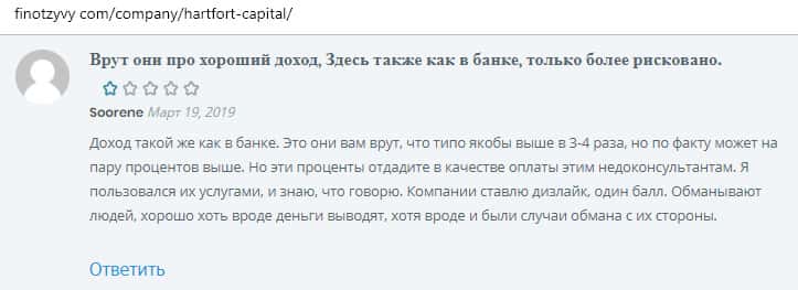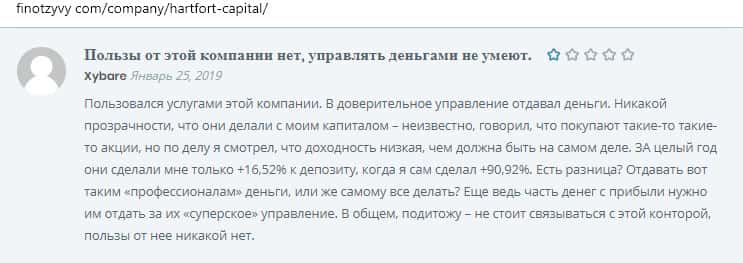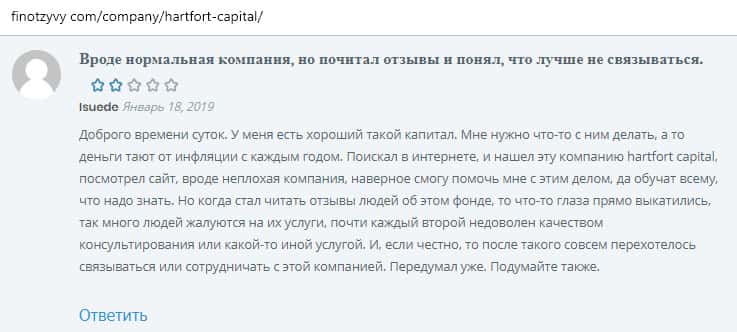 По мнению еще одного человека, который хотел стать клиентом конторы Харт Форт Капитал, у них очень плохое обслуживание, так как сотрудники не имеют ни малейшего представления о том, как работает рынок акций или системы реестра аккаунта. О каких инвестициях может вообще идти речь.