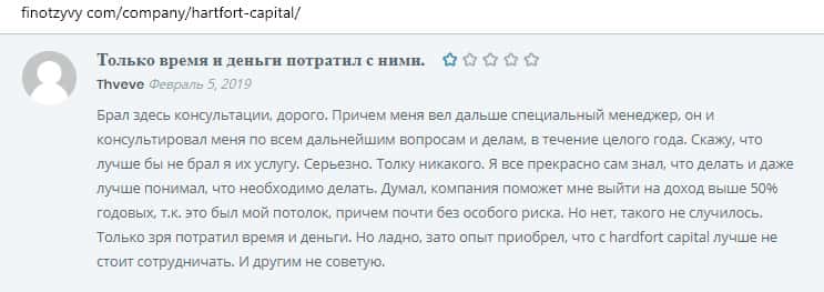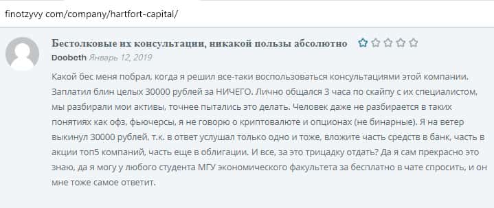 Когда клиент начинал работу с конторой HartFortCapital ему обещали, что есть варианты заработать на их консультациях хорошие деньги. Аферисты попросили проплатить услуги наперед по завышенным ценам, но как оказалось потом они даже не предоставили никаких отчетов о проделанной работе. Естественно никто деньги так и не вернул.