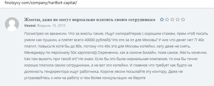 По мнению очередного пользователя сети, у вас не получится поправить свое финансовое положение, если вы начнете сотрудничать с аферистами Харт Форт Капитал, а тем более человек не советует работать там. Отношение к своим сотрудникам настолько скотское, что вы будете себя чувствовать там унылым говном, которому не платят зарплату.