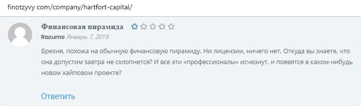 По мнению автора статьи на одном из ресурсах, лохотрон Харт Форт Капитал не рекомендуемая конторы для инвестирования средств, да и вообще для сотрудничества. У них нет никаких лицензий, внутренних документов, а также аферисты обещают высокую доходность, что не может не настораживать.