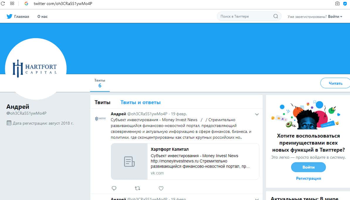 - Деятельность лохотрона HartFortCapital в социальных сетях