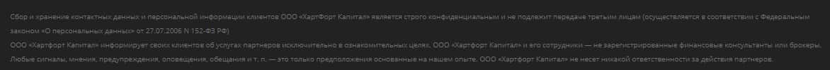 Аферисты Харт Форт Капитал не предоставили ни единого внутреннего регулирующего документа, на который можно было бы опереться при принятии решения. Нет ни договора, ни политики конфиденциальности, поэтому только Бог знает, на каких условиях с ними можно работать. Один сплошной подводный камень.