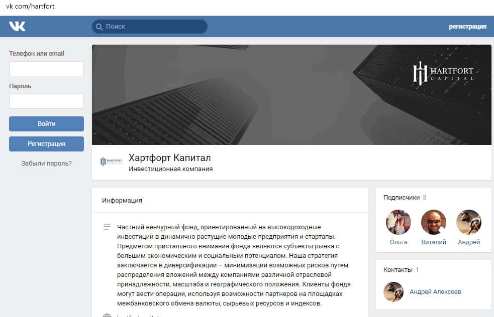 Шулера консалтинговой конторы HartFortCapital находятся в постоянном поиске новых клиентов, которых они хотят сделать своими жертвами. Для этого они орудуют в социальных сетях, где ведется первичная обработка лоха. Чтобы не быть тем самым лохом, предлагаем ознакомиться с их группами:
