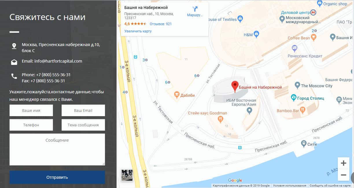 Для связи со своим комьюнити, аферисты HartFortCapital предоставили на своем сайте номера телефонов, электронную почту и даже почти точный адрес офиса в Москве. Если вас опрокинут, то на контакты звонить смысла нет, а вот найти офис и наказать обидчиков можно. А вот собственно и сами данные: