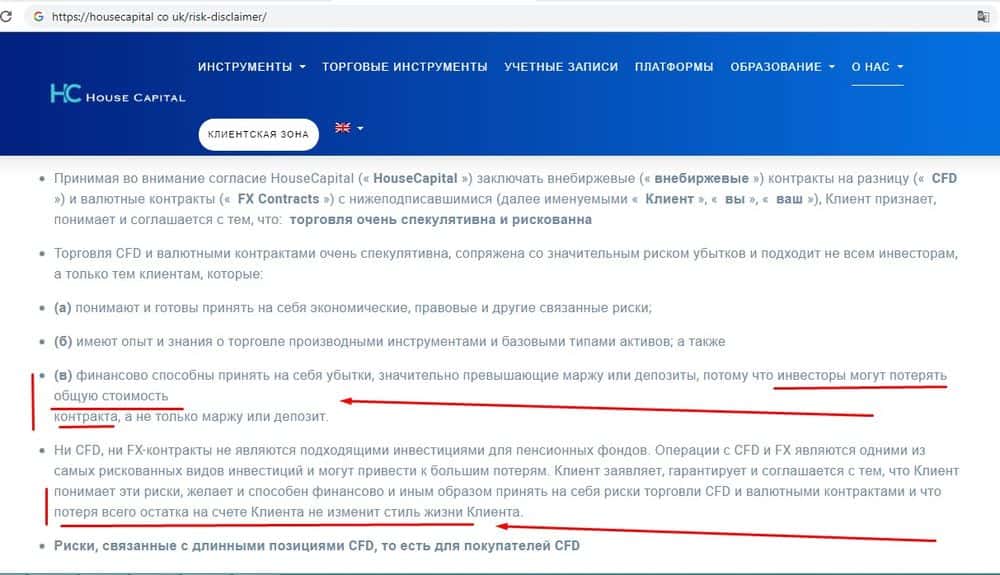 Как такового соглашения с клиентом у жуликов HouseCapital нет, зато есть раздел с условиями, обязанностями и отказ от ответственности. Странно представить трейдера, который, прочитав их, согласится сотрудничать с аферистами. Краткая суть: мы ответственности не несем ни за что, готовьтесь потерять деньги.
