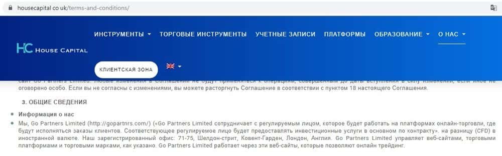 С регуляцией у мошенников Хаус Капитал все очень сложно и путано. Непосредственно у них ее нет. На сайте указано, что HouseCapital управляется конторой GONNAFLEX Limited. А в условиях есть пункт, по которому все финансовые действия от имени Хаус Капитал будут совершаться некой Go Partners Limited, у которой лицензия якобы имеется.