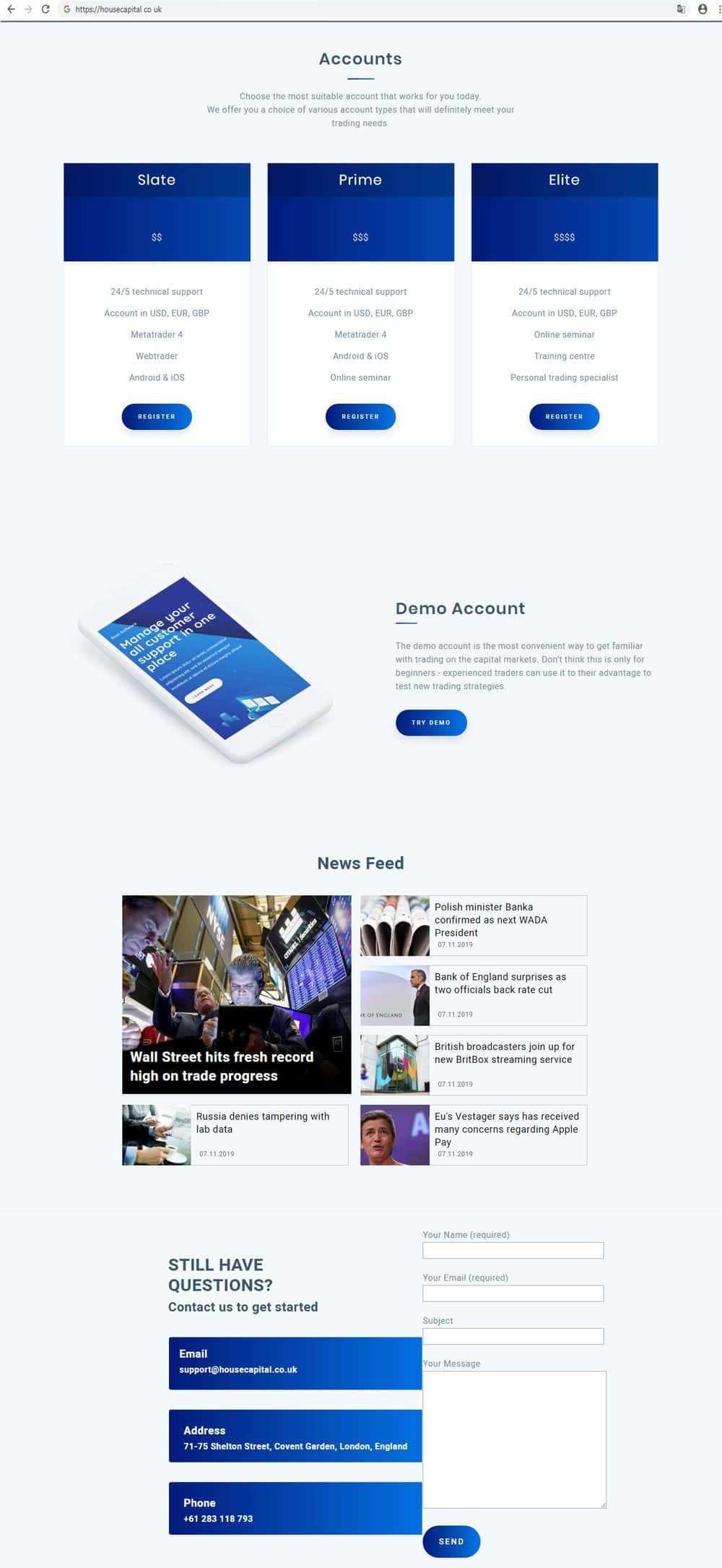 Ресурсы, анализирующие надежность брокеров, например, forexbrokerz com, обратили внимание на кидал HouseCapital: в демонстрационном режиме они предлагают подозрительно высокий уровень кредитного плеча. Некоторые типы счетов требуют высоких начальных инвестиций, хотя разница между ними на самом сайте не указана.