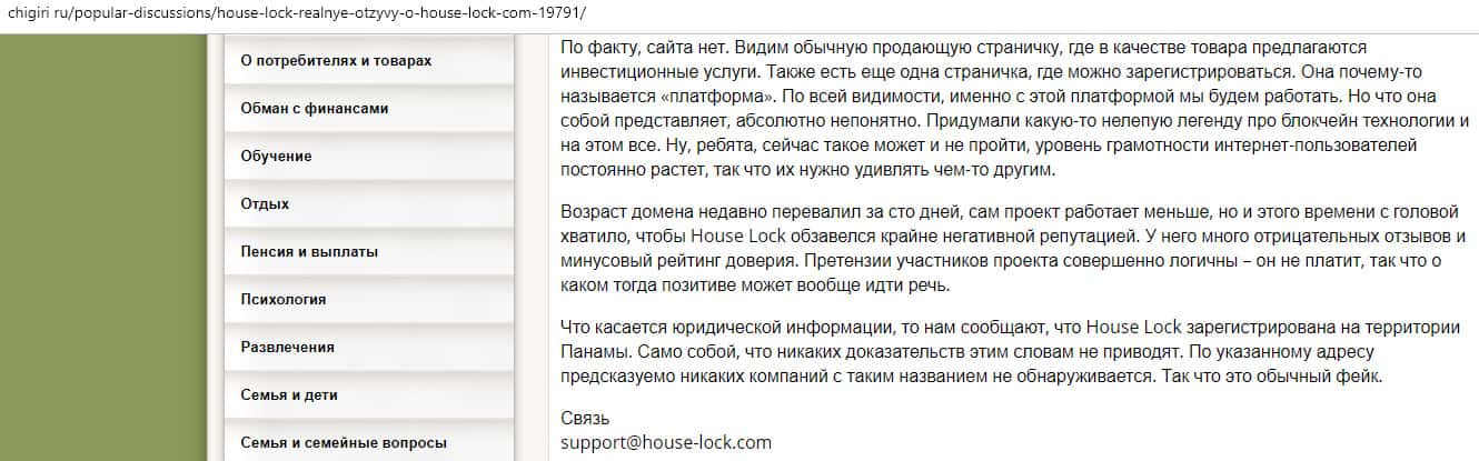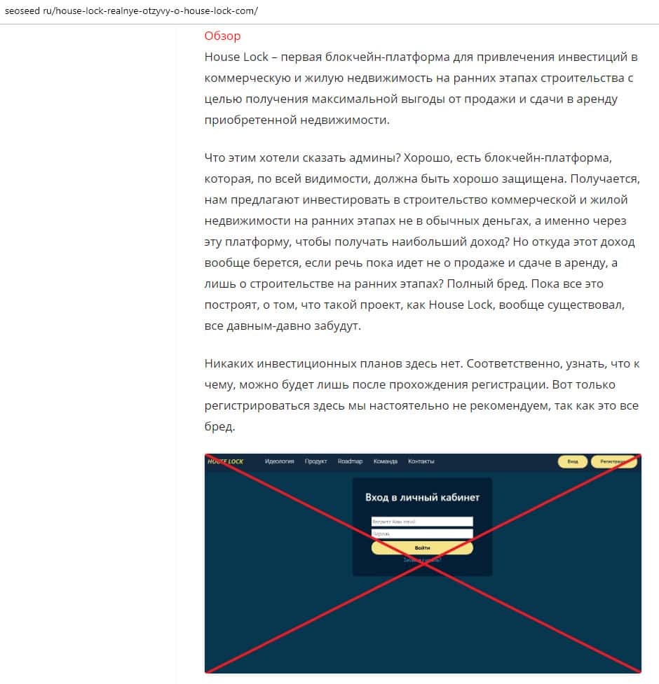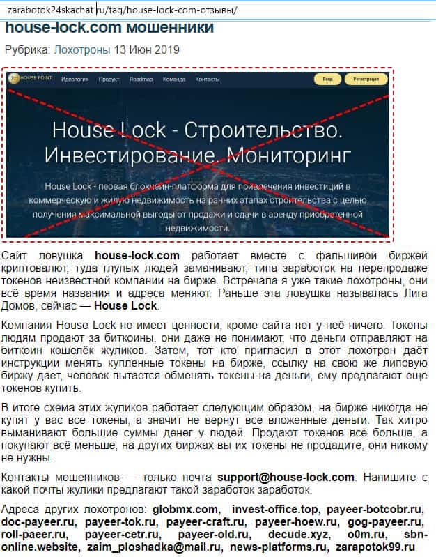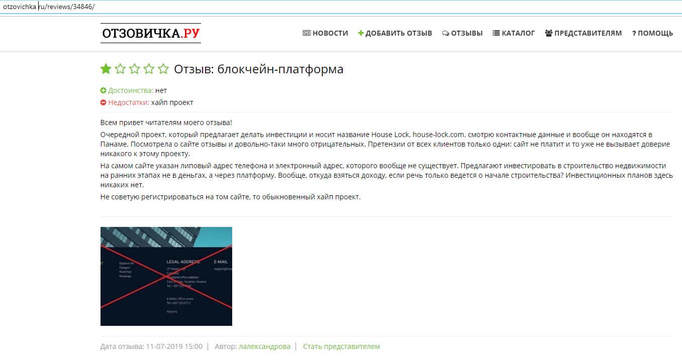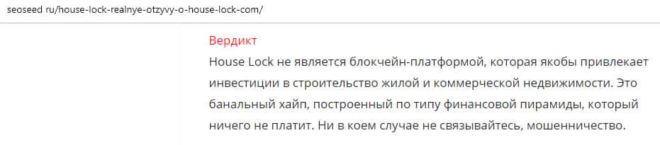 Еще на одном ресурсе нам удалось найти статью-обзор, где анализируется деятельность лохотрона HouseLock. Раньше подобный проект назывался Лига Домов, а сейчас переименовали в это название. Они не имеют никакой ценности и подтверждения, что реально существуют, поэтому не стоит вестись на этот развод.