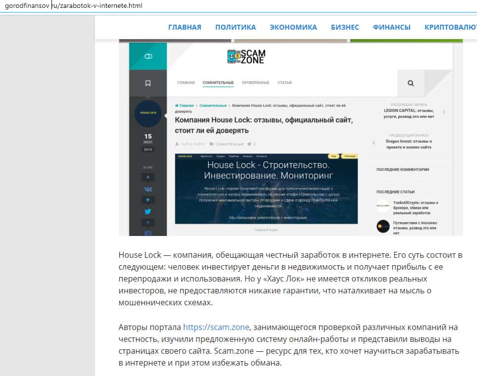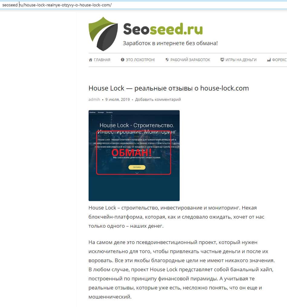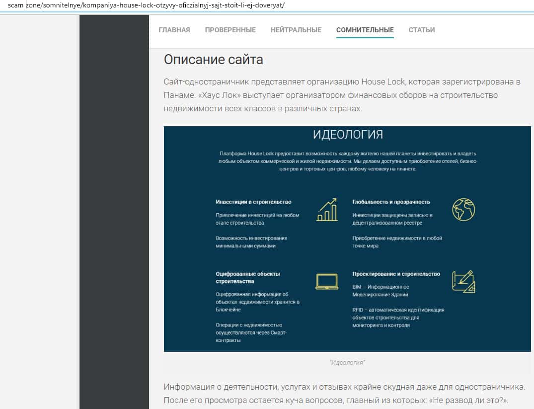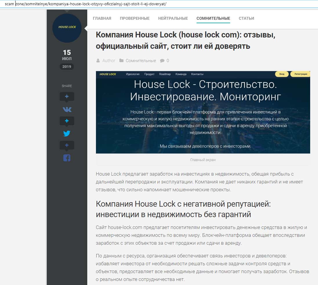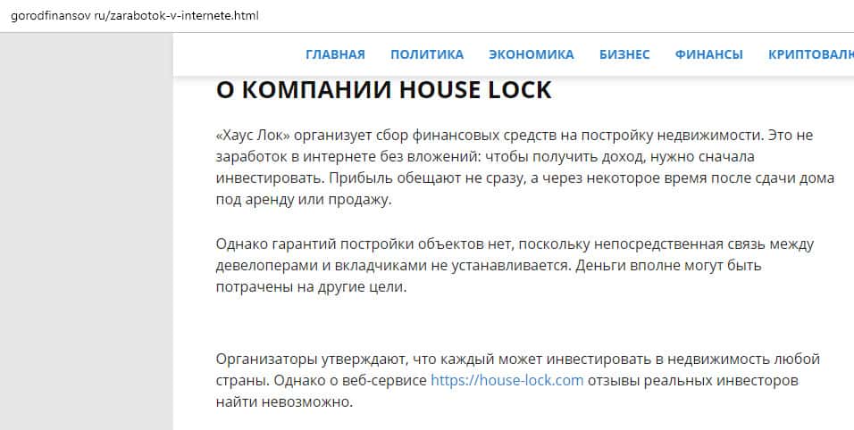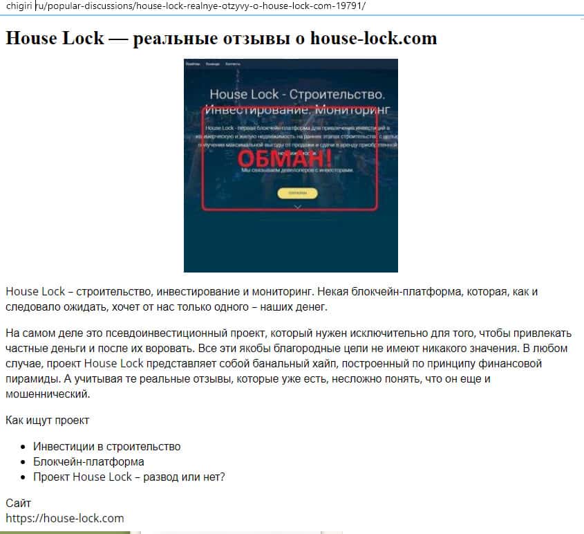 Далее представлена статья о мошенниках HouseLock, которые предлагают заработок на инвестициях в недвижимость, обещая несметные богатства. Контора конечно же не дает никакой гарантии и в интернете не имеет ни одного отзыва. Скорее всего они просто подчищают негатив, поэтому сильно похоже на мошеннический проект.